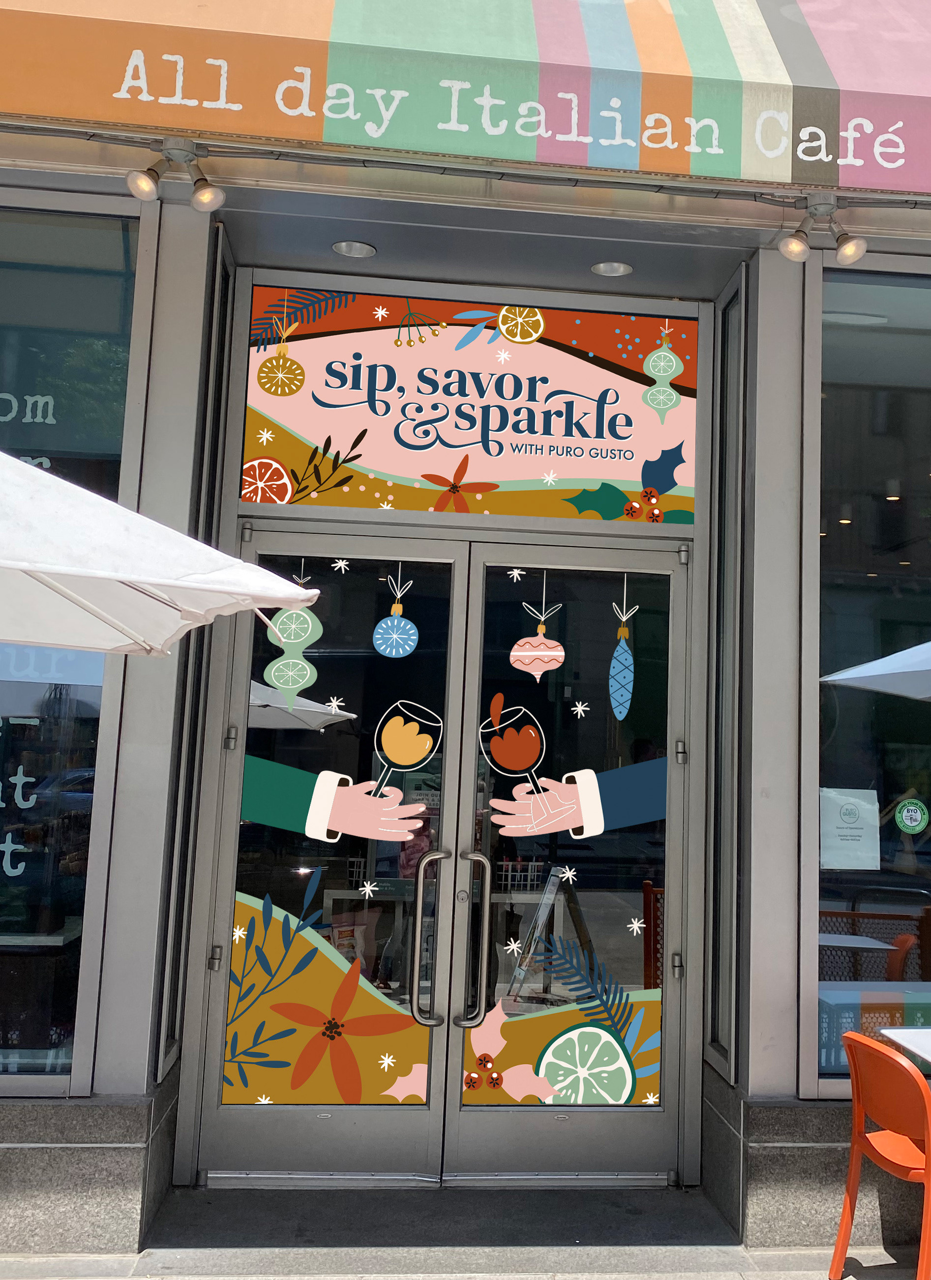 Puro Gusto is an international café brand with a strong footprint outside the U.S. and a flagship location in Washington, DC. Unlike traditional grab-and-go coffee chains, Puro Gusto offers a refined, all-day café experience that blends specialty coffee, fresh food, and a robust cocktail selection, including its signature bottomless aperitivo. Rooted in global café culture, the brand emphasizes atmosphere, social connection, and elevated moments—making it a natural platform for immersive, seasonal campaigns.