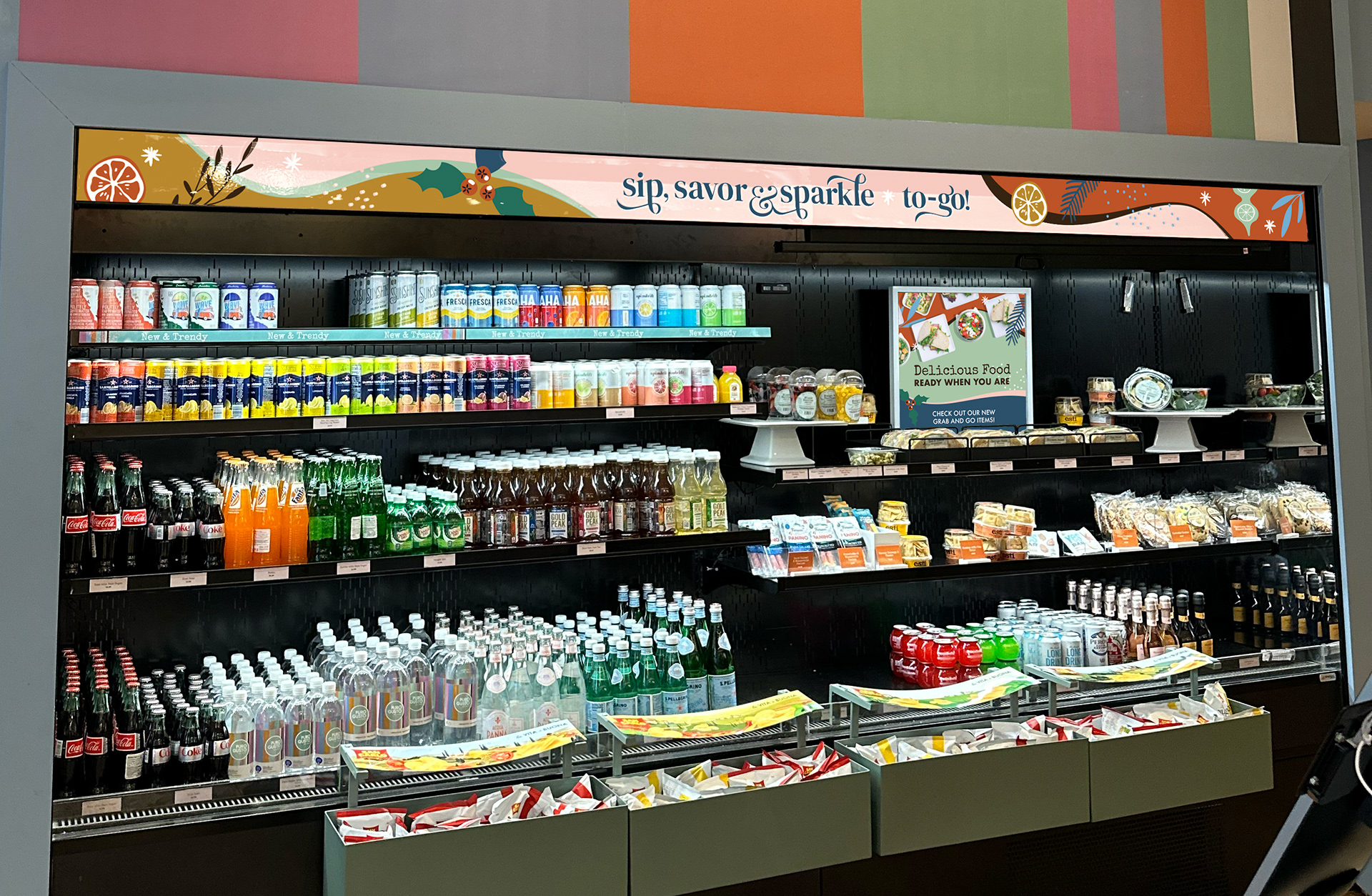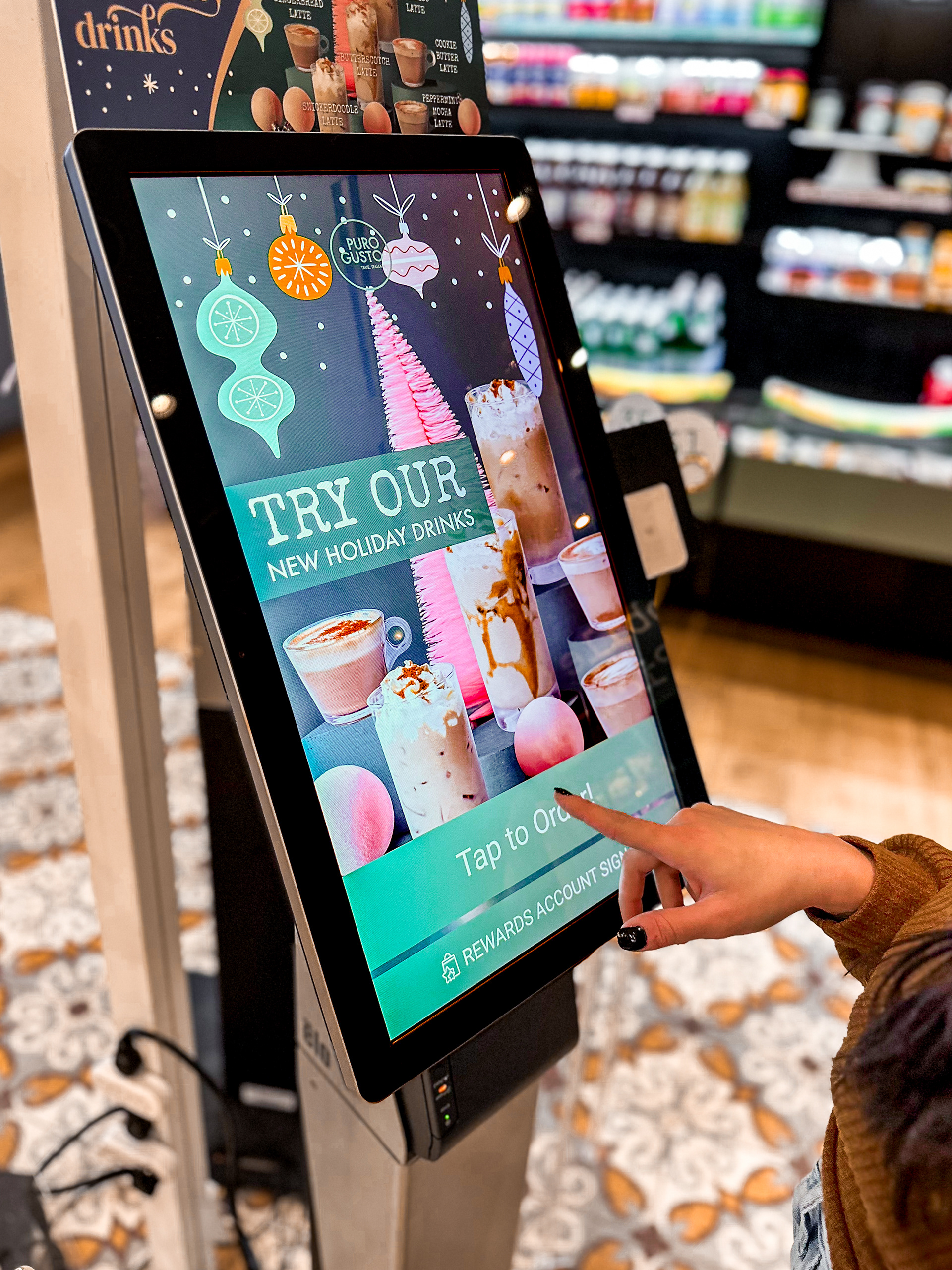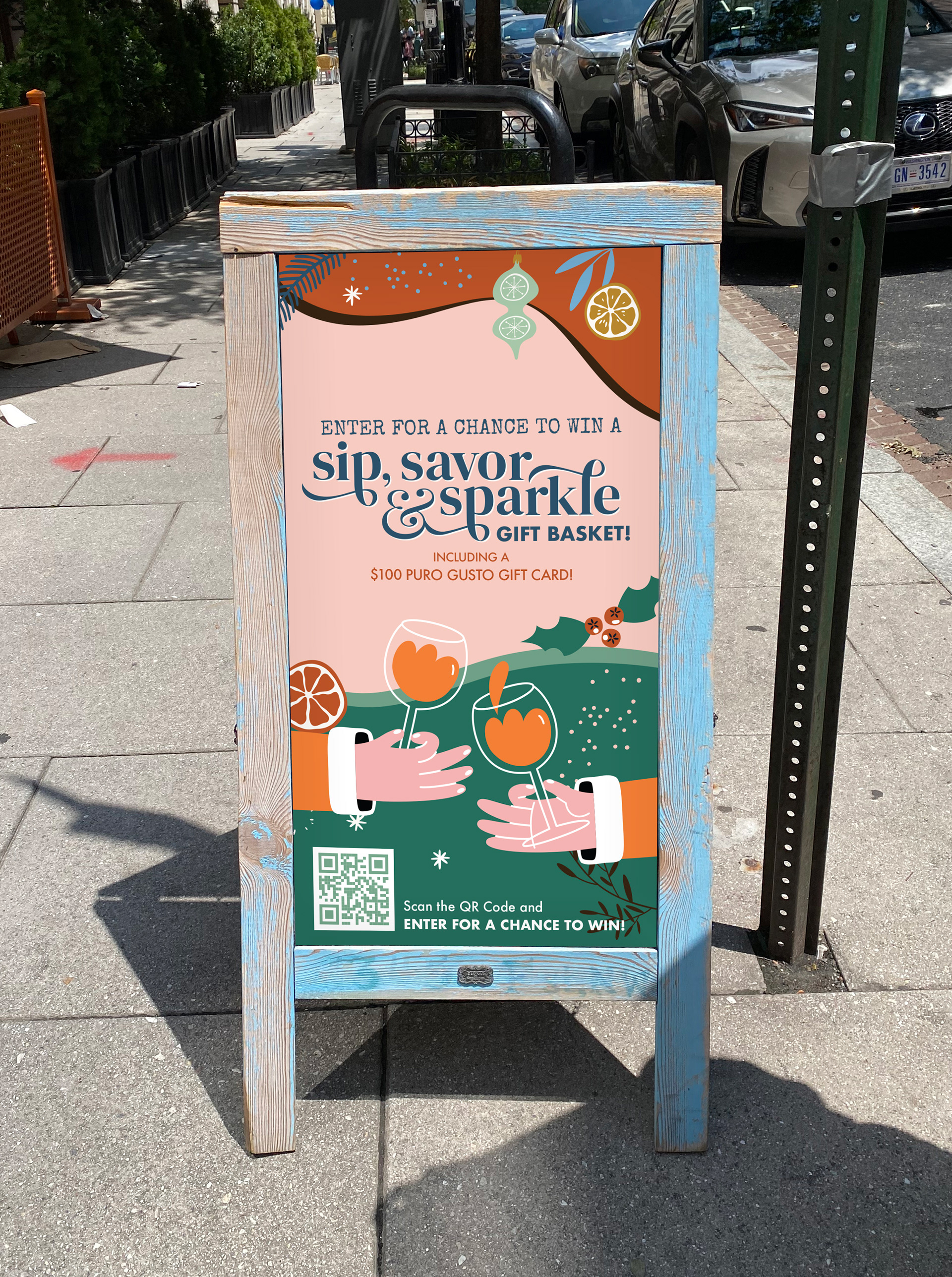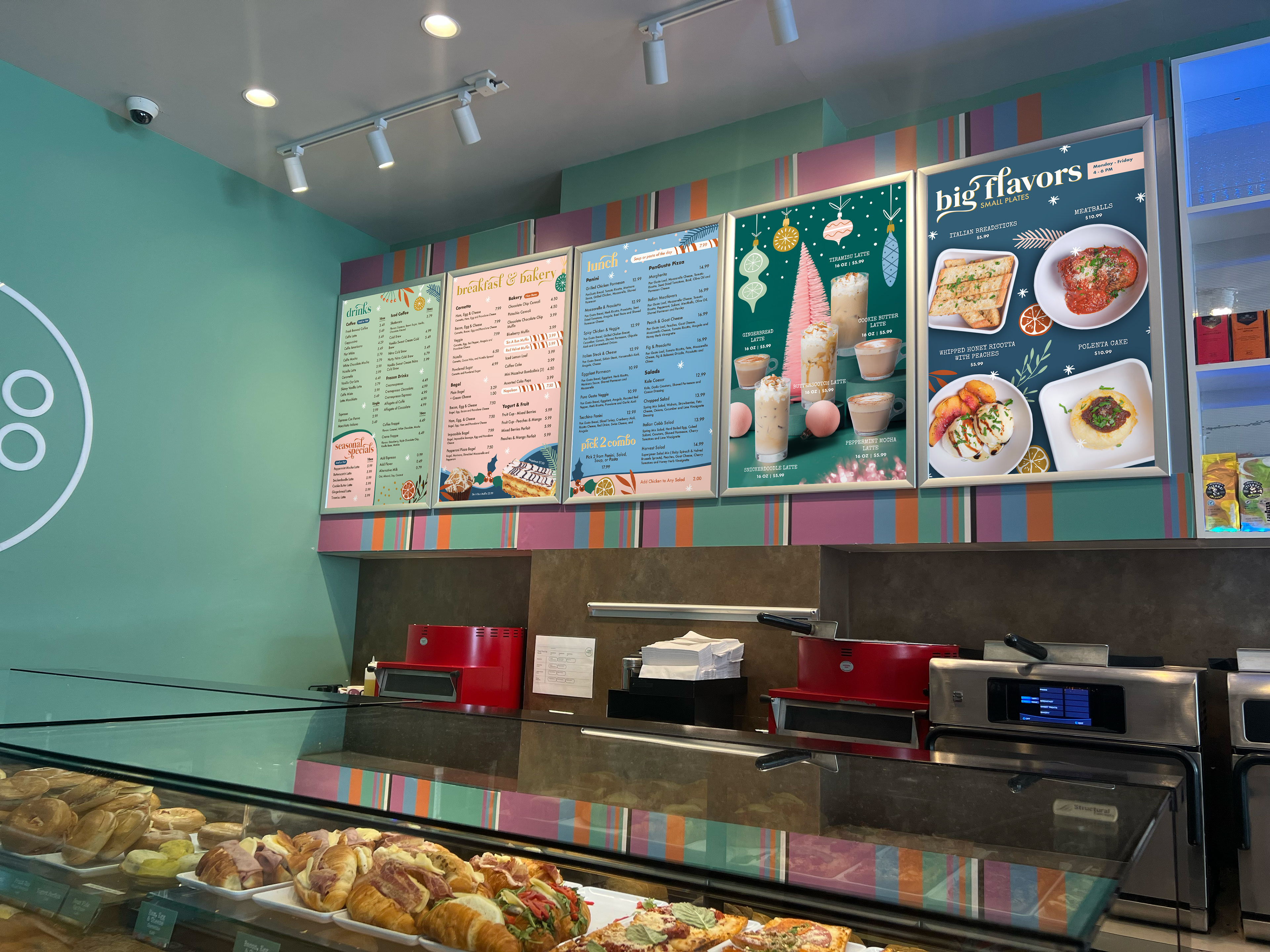 The use of pink and teal (intentionally nontraditional holiday colors) reinforced the midcentury inspiration while creating a fresh visual cohesion with Puro Gusto’s existing brand palette. The result was a seasonal identity that felt festive yet unexpected, positioning Puro Gusto as a destination for elevated, experiential café culture rather than a traditional grab-and-go coffee brand.