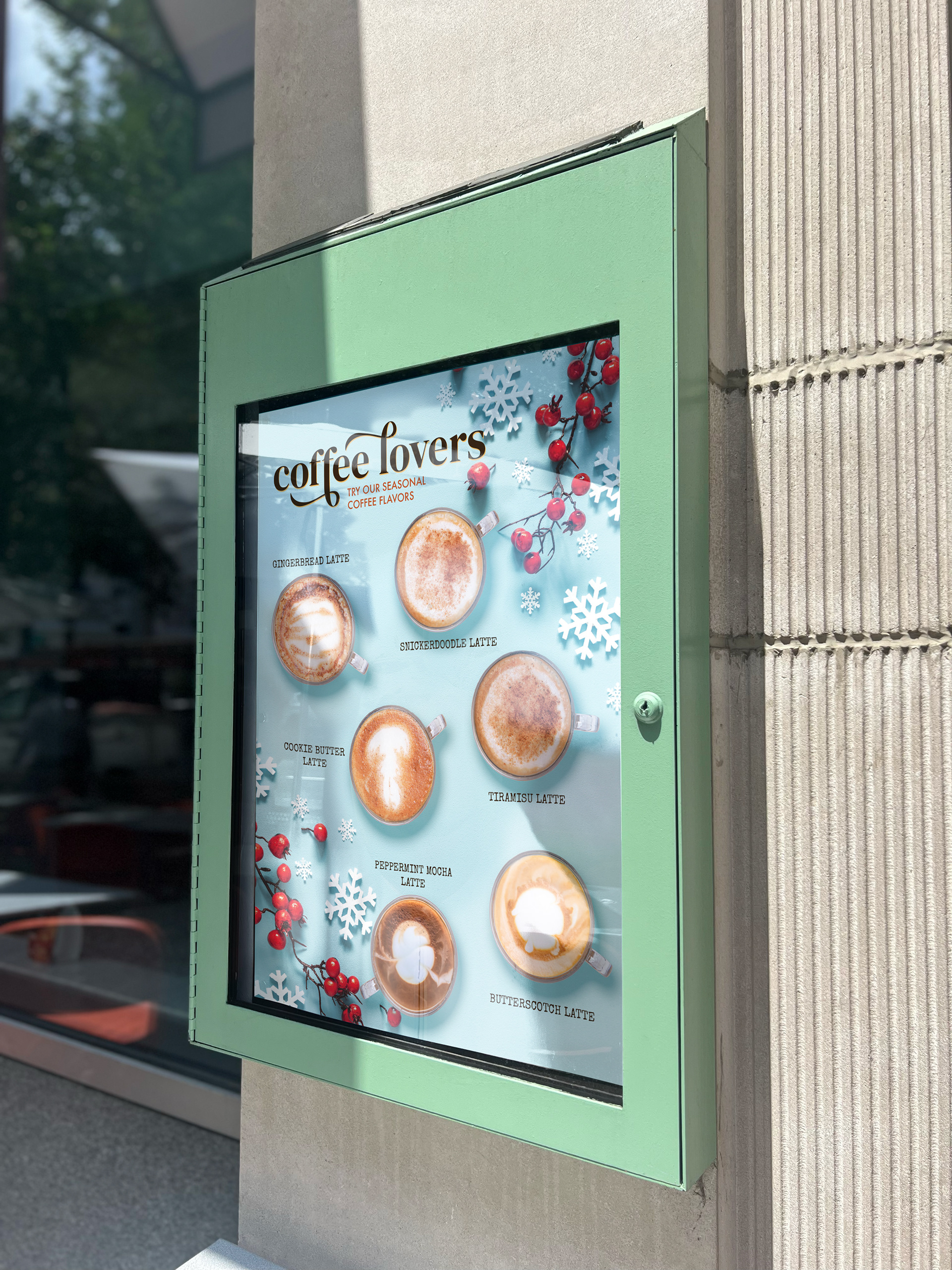 Our focus for this campaign was on coffee drinks and cocktails. We wanted to create a festive environment that people could go to after an office holiday party, or to grab coffee with a friend home for the holidays.