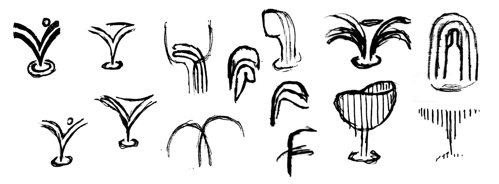 The final design features a subtle geometric interpretation of a fountain. The angular form and bold linework echo the strong linear elements found in the restaurant’s furniture and interior detailing. Curved lines on either side reference the concentric circles from the original wordmark and, when intersecting with the vertical elements, create a discreet “F” monogram.